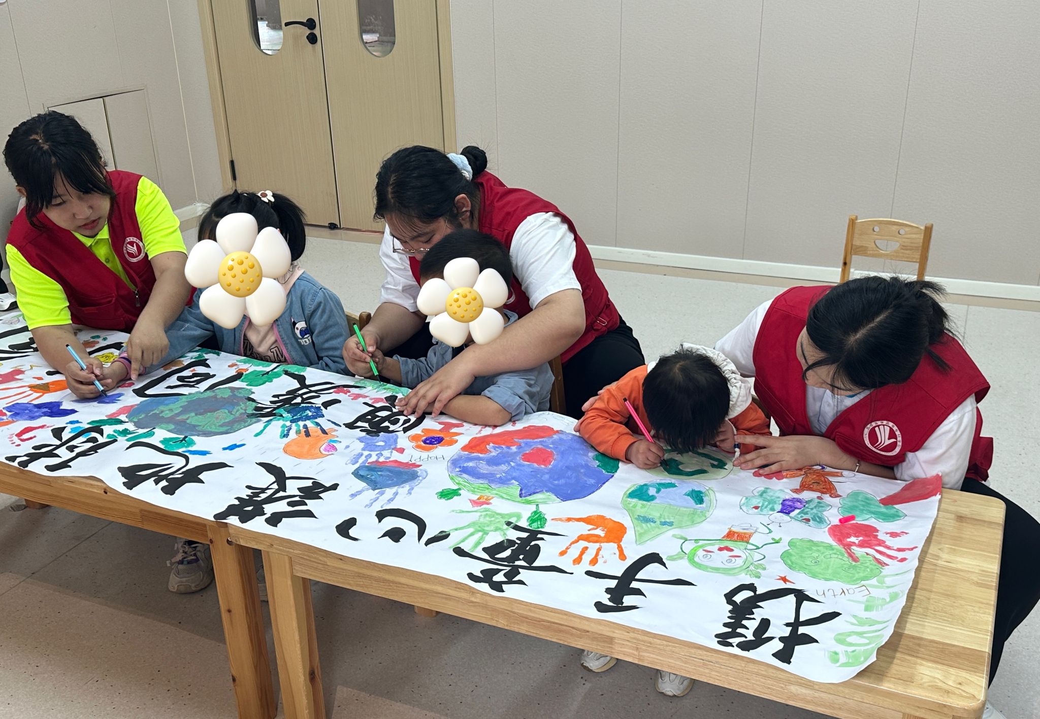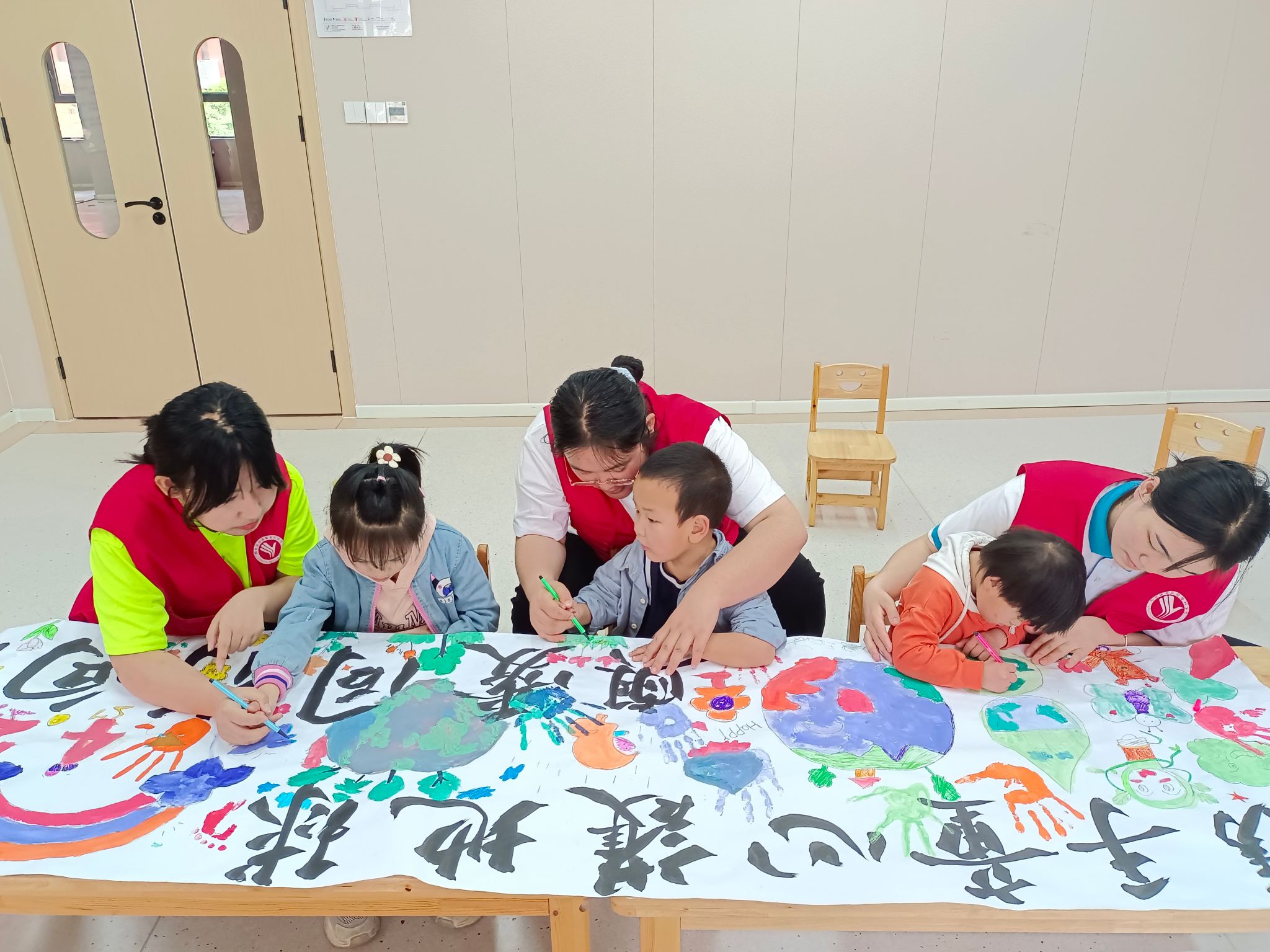 活动中,志愿者向小朋友们介绍了世界地球日的由来,和小朋友们一起进行彩绘创作,构图、描边、调色、涂色……用画笔描绘珍爱的地球,寄托了对保护环境、创造幸福美好家园的向往和憧憬。