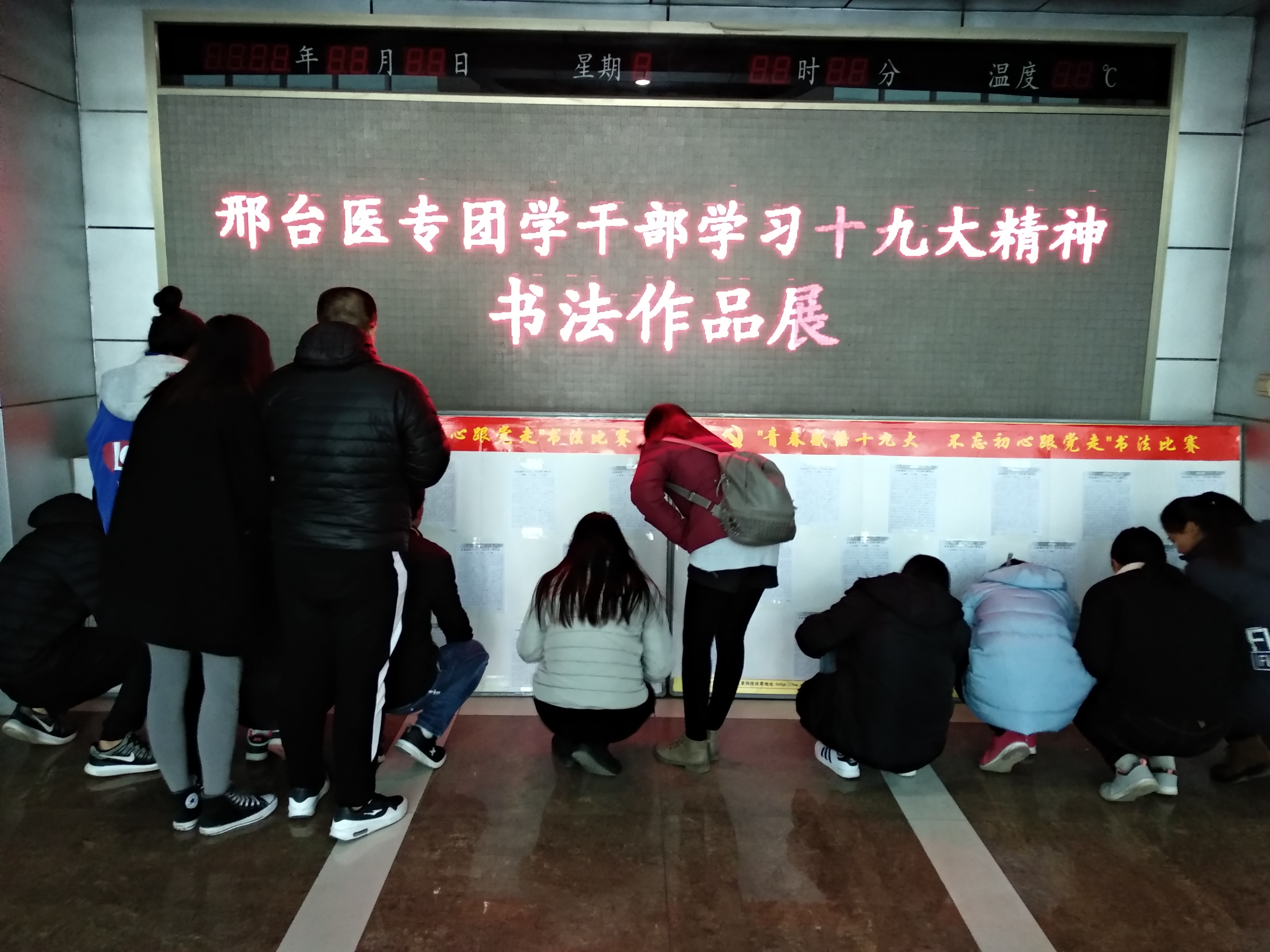 同学们在统一的比赛用纸上,以统一的格式认真书写了十九大报告的主题和意义。一张张工整干净的作品,一个个铿锵有力的笔迹,都展现了同学们学习十九大报告精神的热情和认真态度,本次比赛共收集了30余副作品,并在图书馆二层大厅进行展出。广大同学们纷纷驻足观看,认真学习着十九大精神。