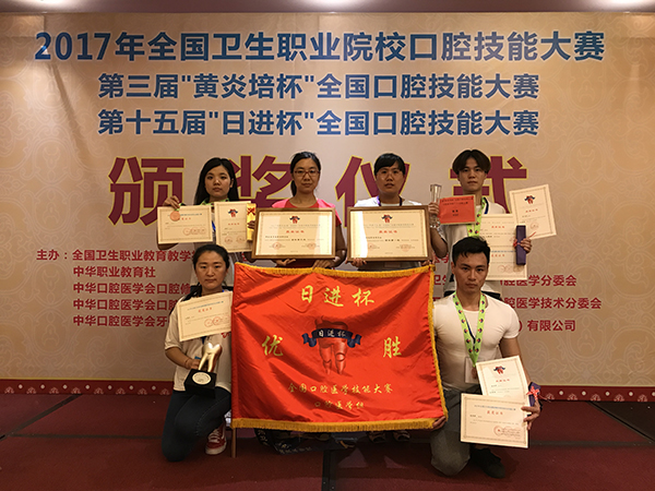 来自全国63所高职高专院校的210名学生参加了比赛。比赛中,我校选手们沉着应战,稳定发挥,共获得个人一等奖3项,二等奖2项、三等奖2项,其中翁光钦荣获2017年全国卫生职业院校口腔技能大赛牙体制备比赛一等奖、第三届“黄炎培杯”全国口腔技能大赛口腔医学组个人全能比赛银奖、第十五届“日进杯”全国口腔医学技能大赛牙体制备组技能大赛牙体预备二等奖,张伟锋荣获2017年全国卫生职业院校口腔技能大赛牙体制备比赛一等奖、第十五届“日进杯”全国口腔医学技能大赛牙体制备窝洞制备三等奖,王聪艺荣获2017年全国卫生职业院校口腔技能大赛雕牙和排牙比赛一等奖、第十五届“日进杯”口腔医学技能大赛牙体雕刻组三等奖,王晋玉荣获2017年全国卫生职业院校口腔技能大赛雕牙和排牙比赛二等奖。张艳丽、郝立辉,孙建欣、崔俊霞4名教师分获牙体制备组、雕牙排牙组优秀辅导教师奖。学校荣膺第十五届“日进杯”全国口腔医学技能大赛牙体制备组团体第一名、雕牙排牙组团体第三名,赢得口腔医学组全国第一名优胜旗,取得我校参赛以来的最佳成绩。