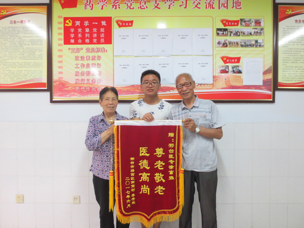 6月5日下午,药学系迎来了两位特殊的客人,他们是邢台市桥西区南高村李秀荣夫妇,两位老人手持“尊老敬老,医德高尚”的锦旗,专程来表达对药学系2015级高护6班徐富强同学的感激之情。