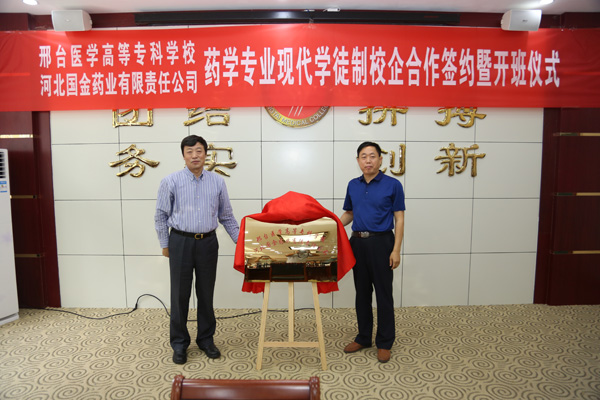 最后,李朝鹏副校长与张四岩董事长签订了校企合作协议。李占华书记与张四岩董事长共同为药学专业现代学徒制培训班进行了揭牌。