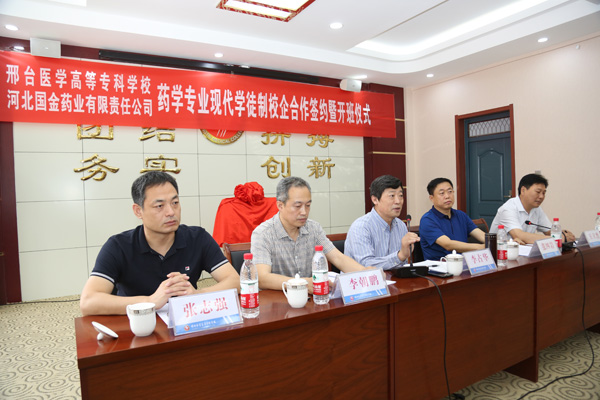 会上, 学校党委委员、副校长李朝鹏从专业设置、课程建设、实验实训室建设、招生就业情况等方面简要介绍了学校的基本情况。河北国金药业有限责任公司董事长、总经理张四岩从企业发展方向和国金药业新厂区建设规划情况介绍了企业的基本情况。药学系副主任张立峰宣读了《邢台医学高等专科学校与河北国金药业有限责任公司合作成立药学专业现代学徒制班实施方案》。
