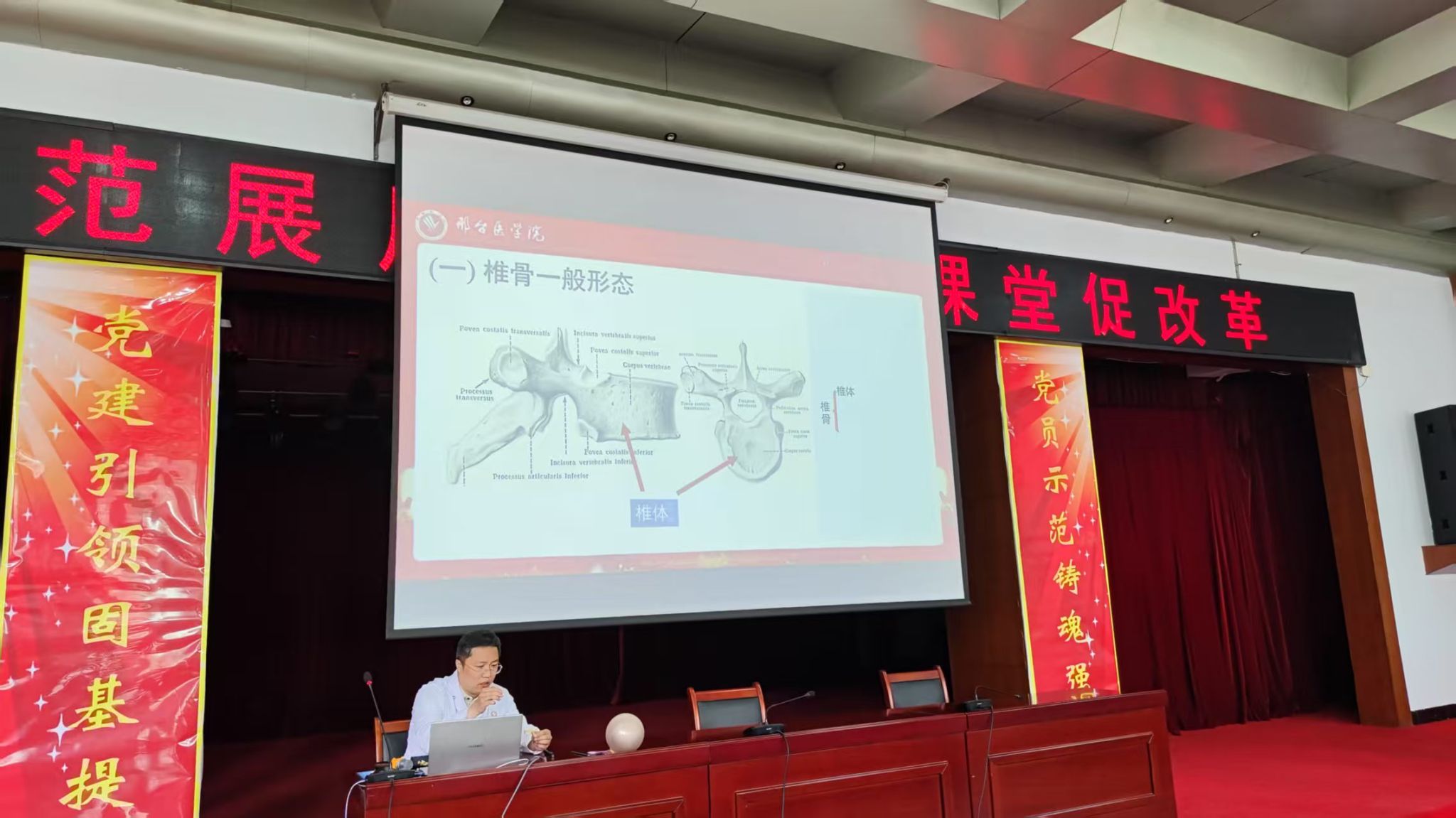 机关第二党支部王刚老师以《系统解剖学—椎骨》为题进行示范授课。王刚老师在说课中讲授了课程特点以及教学手段,以临床病例导入,为方便学生观察椎骨形状特征,通过手绘图像、课堂直播展示骨骼,加深学生对椎骨的记忆,将知识点融会贯通,既增加学生兴趣,又容易理解记忆,提高了学习效率。