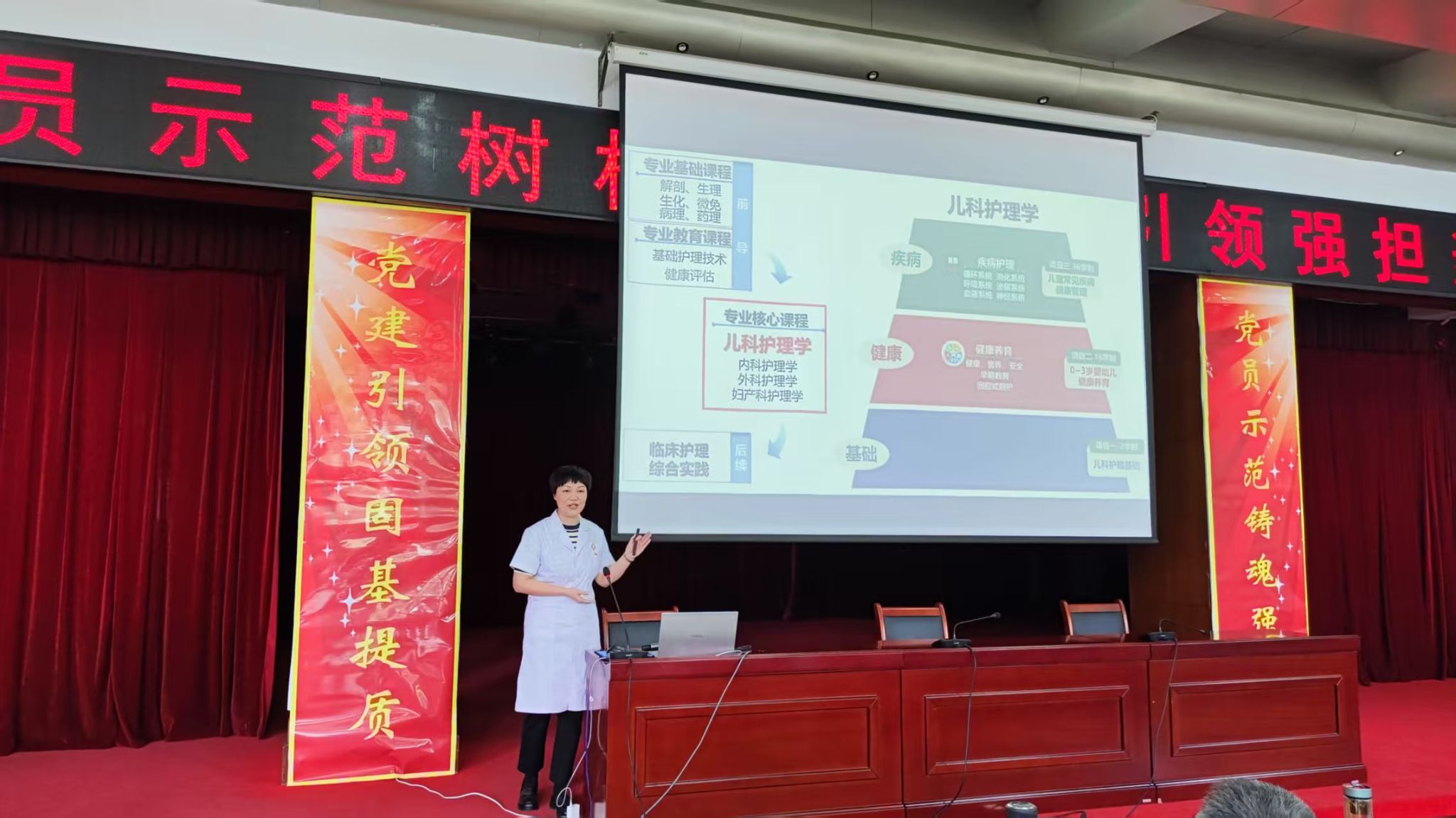 活动中,护理系教工第二党支部王松梅老师以《儿科护理学—早产儿的护理》为题进行示范授课。王松梅老师先进行了说课,讲解了教学整体设计和课程思政思路,并以早产儿案例导入课程,通过临床病例分析、肺泡作用原理模拟,结合“护士资格考试”真题详细讲解了早产儿呼吸问题及护理、用药等内容,展示了触发初心、激发信心到焕发爱心的教学实施过程,呈现了一堂与众不同的示范课。