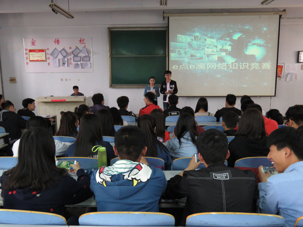 为丰富同学们的校园文化生活,增强同学们的网络安全防范意识,4月13日下午由我校团委电脑爱好者协会主办的e点e滴网络知识竞赛在2016级普口1班教师举行。校团委各社团干部及成员100余名同学观看了比赛。