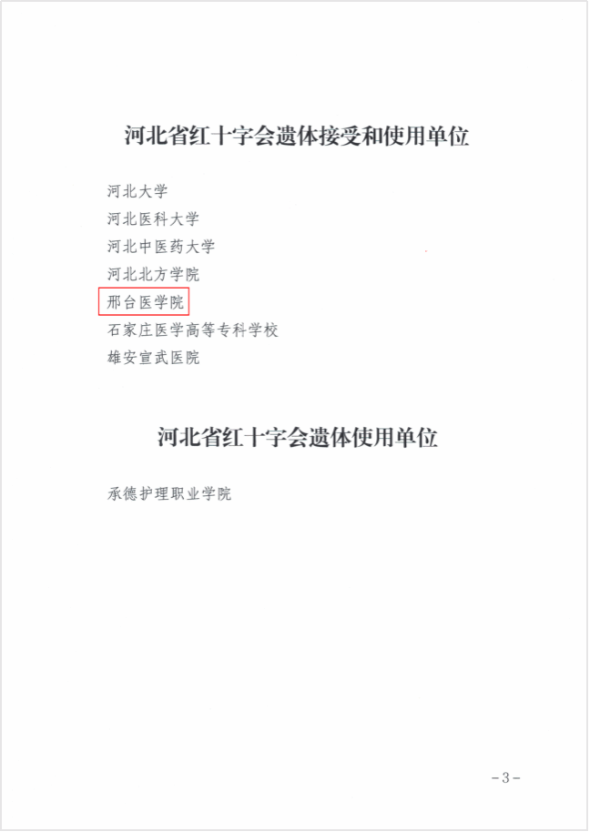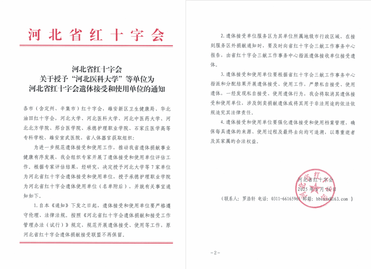 近日,我校获批“河北省红十字会遗体接受和使用单位”,成为全市首个具备专业资质的遗体捐献接受机构,对促进全市医学教育发展、科研水平提升及临床技术进步具有重要意义。