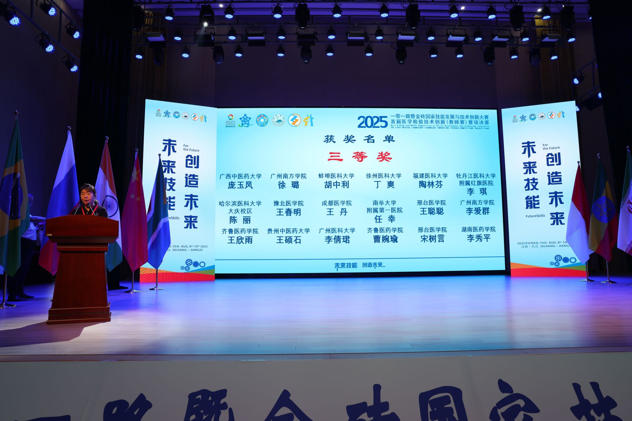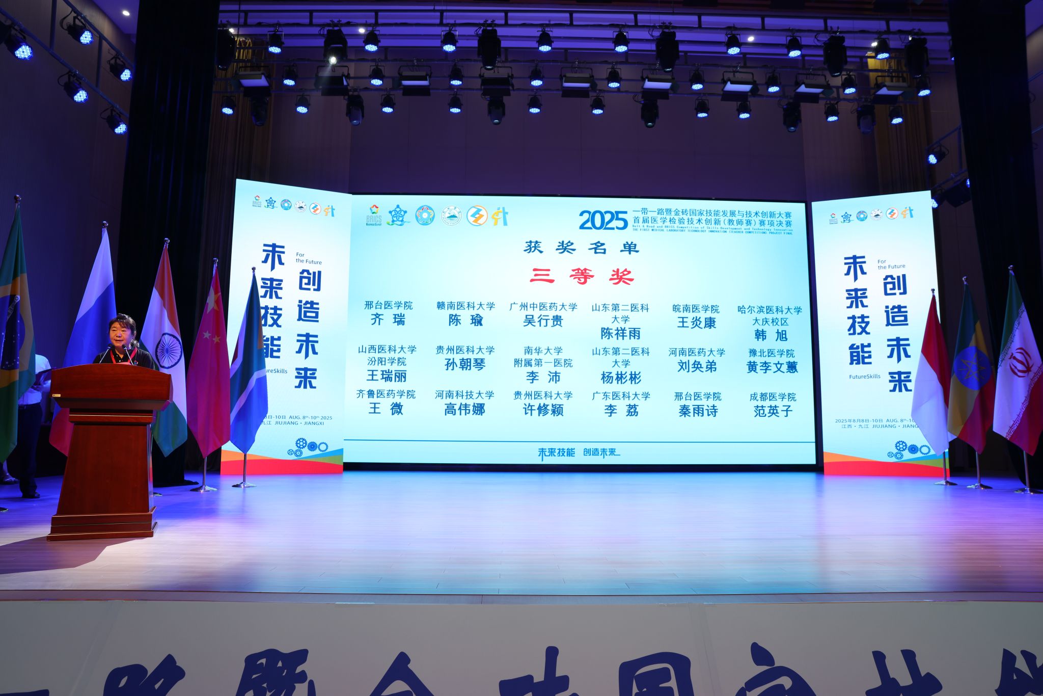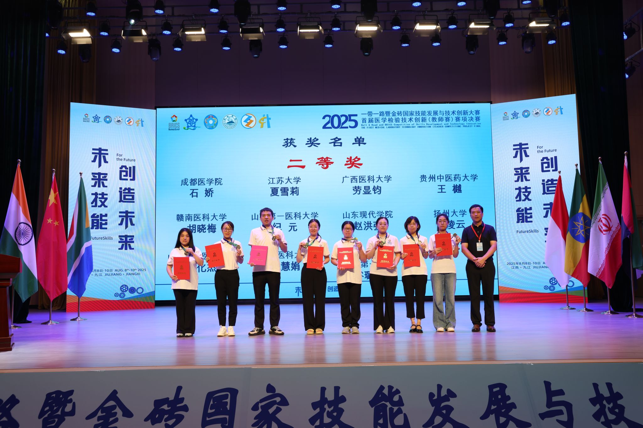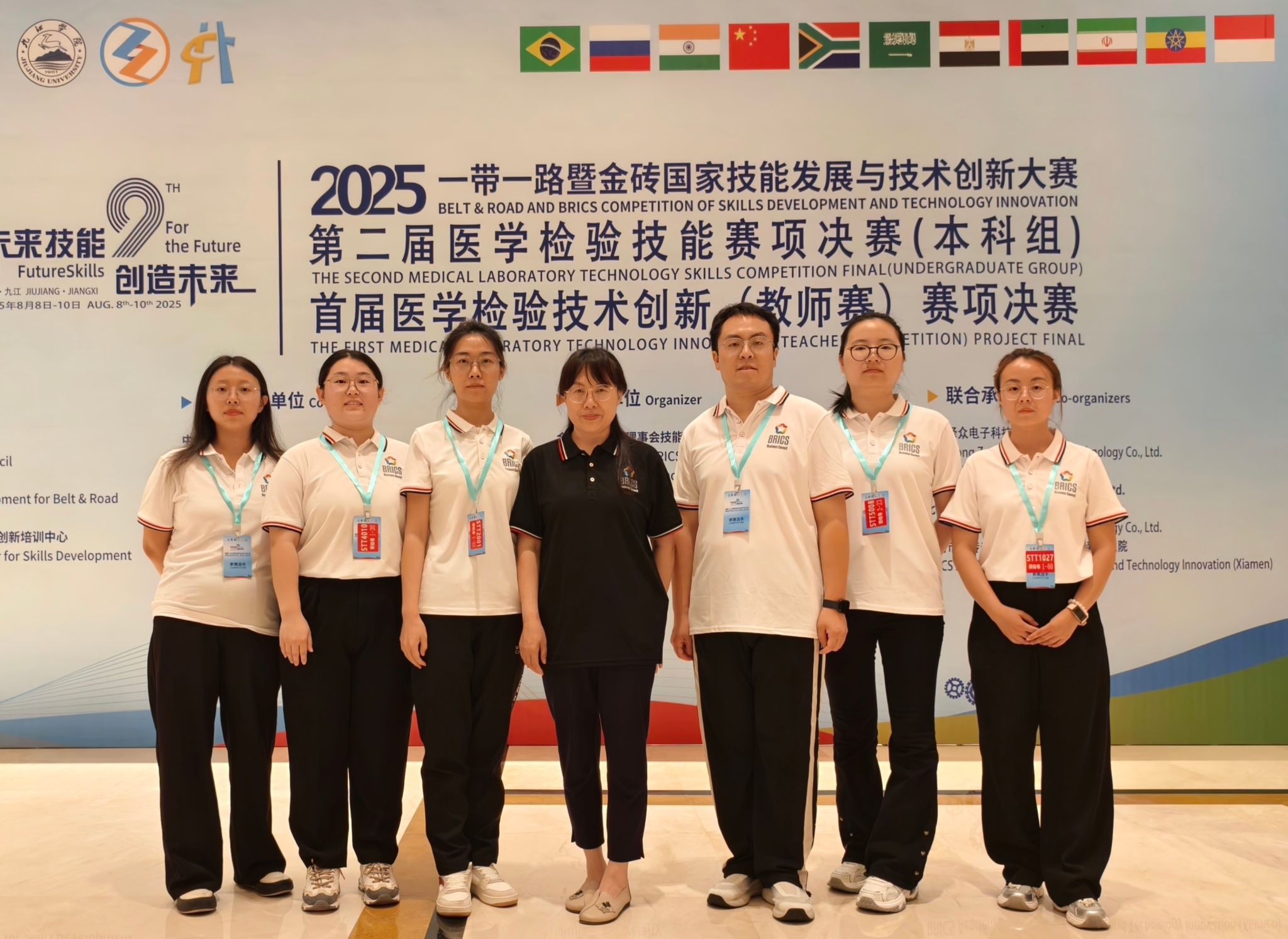 近日,由教育部主办、九江学院承办的2025“一带一路”暨金砖国家技能发展与技术创新大赛落下帷幕。我校医疗技术系王若潼、张笑笑、宋树言、齐瑞、王聪聪、秦雨诗6名教师在医学检验技术创新赛项中,凭借扎实的专业功底与创新实践能力,斩获二等奖1项、三等奖5项,学校荣获“优秀组织奖”。
