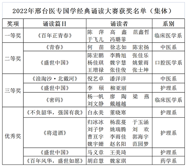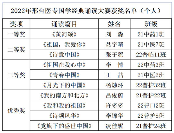同学们通过慷慨激扬的诵读,传递了爱党爱国的热情、勇于拼搏的激情、青春奋斗的豪情,展示了赤诚的爱国之心和积极向上的良好风貌。最终,2021级中药1班刘淼诵读的《黄河颂》获个人组冠军,临床系陈萍、高鑫等5人诵读的《百年正青春》获团体组冠军。