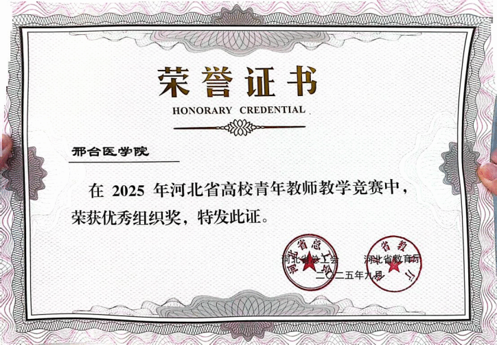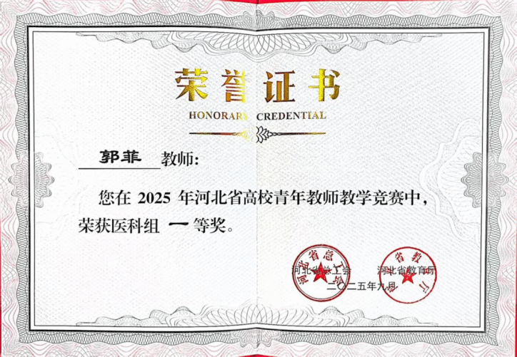 9月30日,由河北省总工会、河北省教育厅联合主办的全省高校青年教师教学竞赛圆满落幕。基础医学部药理教研室郭菲老师凭借扎实的教学功底、创新的教学设计与出色的现场发挥脱颖而出,斩获一等奖,我校荣获“优秀组织奖”。