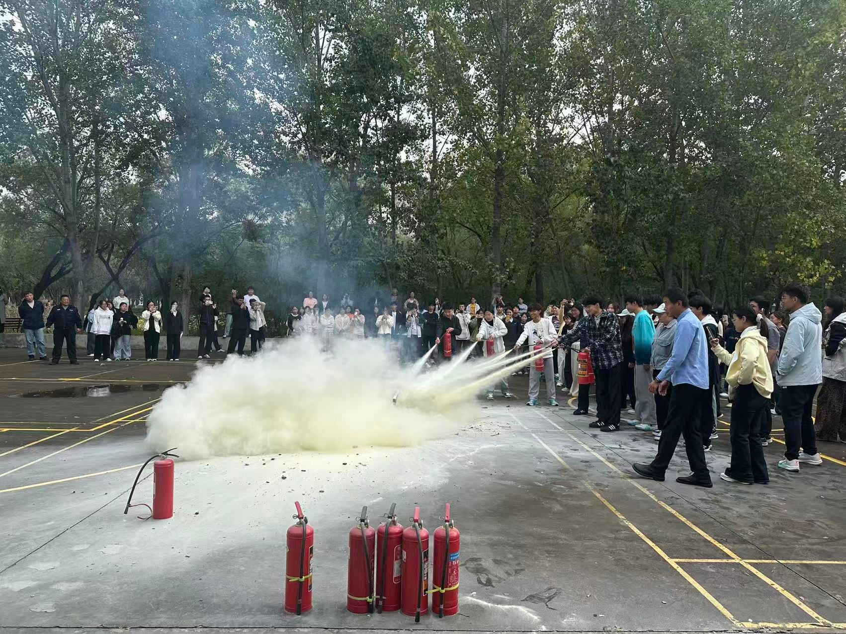 实操演练中,新生分组轮换,使用灭火器扑救模拟火源,辅导员与宿管人员同步参与。指导教员现场纠正握瓶姿势、喷射角度等操作细节,确保学生熟练掌握操作要领。