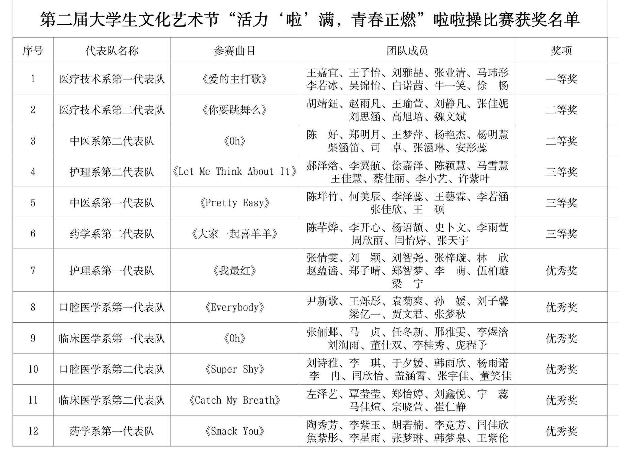 经各系选拔,共有12支代表队入围决赛。决赛中,1号参赛队的《我最红》以热烈开场引爆全场;3号参赛队的《Supper Shy》和11号队的《Oh》以明快奔放的舞姿诠释无限活力,成为赛场靓丽风景……特邀嘉宾、医疗技术系的王嘉宜和高畅同学以一曲《世界上的另一个我》温情献唱,为大赛画上温馨句点。经过精彩纷呈的激烈角逐,医疗技术系第一代表队凭借富有感染力的编排与完美演绎,成功摘得本次大赛一等奖桂冠。