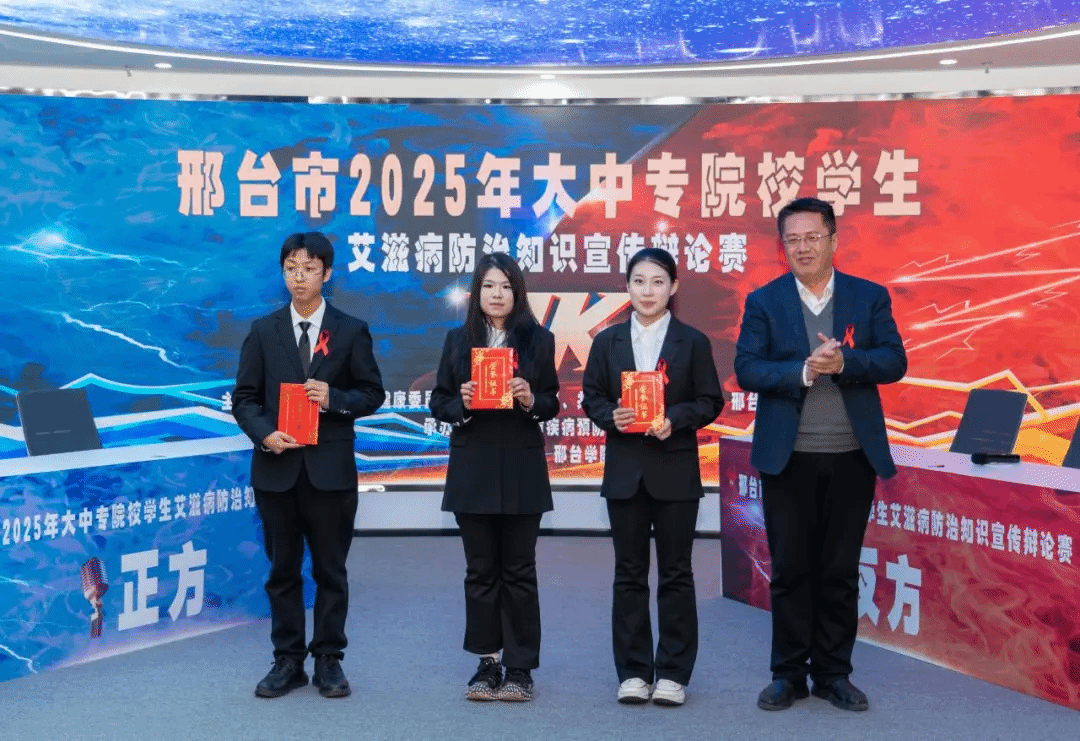 近日,由市卫健委、市教育局、共青团市委、市计生协联合主办的邢台市2025年大中专院校艾滋病防治知识宣传辩论赛总决赛在邢台学院圆满落幕,我校2024级影像本科班谢子瑶、2025级康复治疗学本科3班赵士雄、2024级药学本科2班于欢欢组成的代表队荣获一等奖。