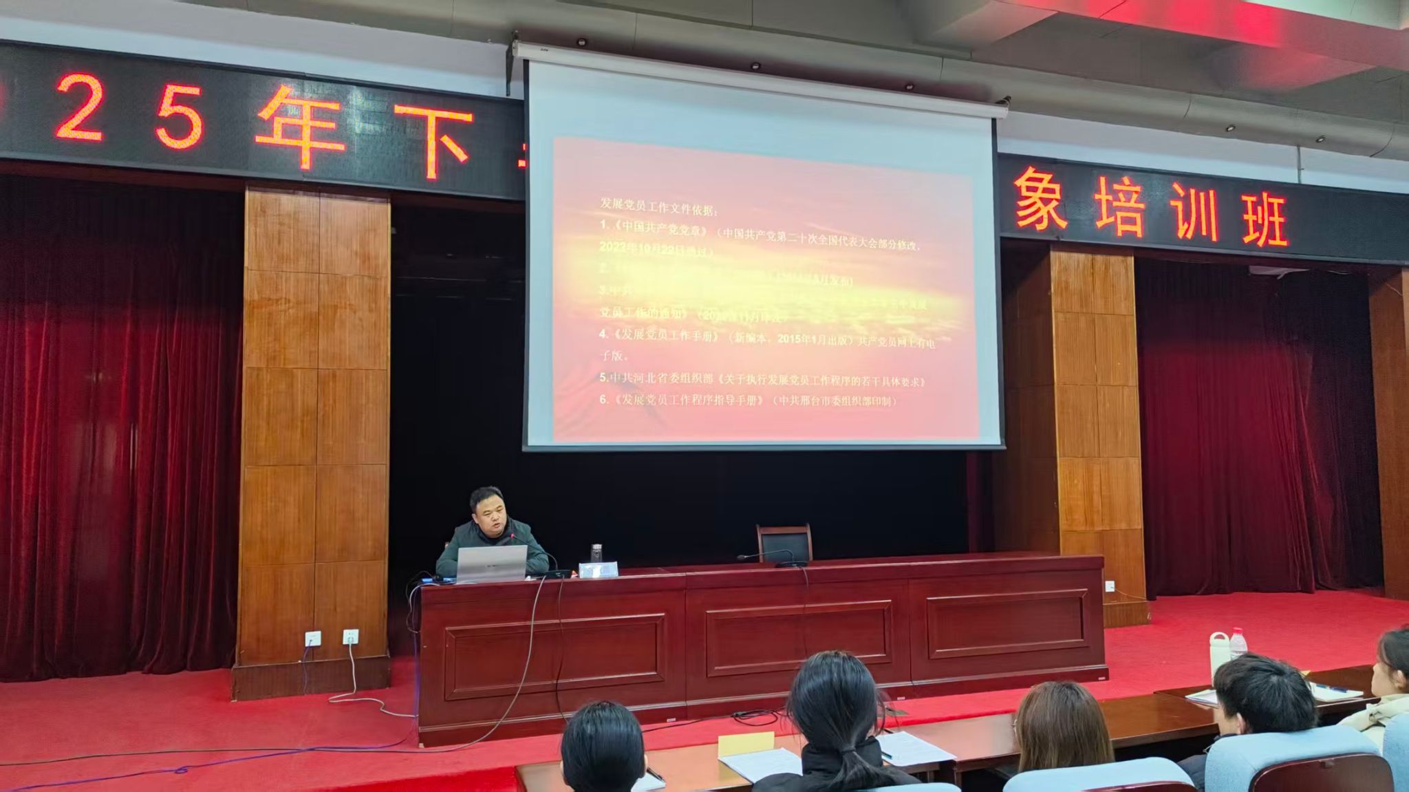 培训期间,达朝玲、王润芳、李宁艳、张献昌四位老师分别围绕《中国共产党的历史责任和重大任务——不断开辟马克思主义中国化时代化新境界》《严守党的纪律和规矩》《学习贯彻党的二十届四中全会精神》《入党流程及相关材料填写说明》作专题讲座。此外,培训班组织学员集中观看了《党史故事100讲》《榜样9》等党性教育视频,并围绕“如何端正入党动机,在思想与行动上积极向党组织靠拢”主题开展分组研讨。组织发展对象利用“冀先锋号”平台自主学习《我的入党志愿书》《党章知识选粹》《“学习贯彻习近平新时代中国特色社会主义思想”公开课》等课程,进一步巩固了理论基础。为检验学习成效,培训班组织全体学员进行了闭卷理论测试,全面考核学员对培训内容的掌握情况。