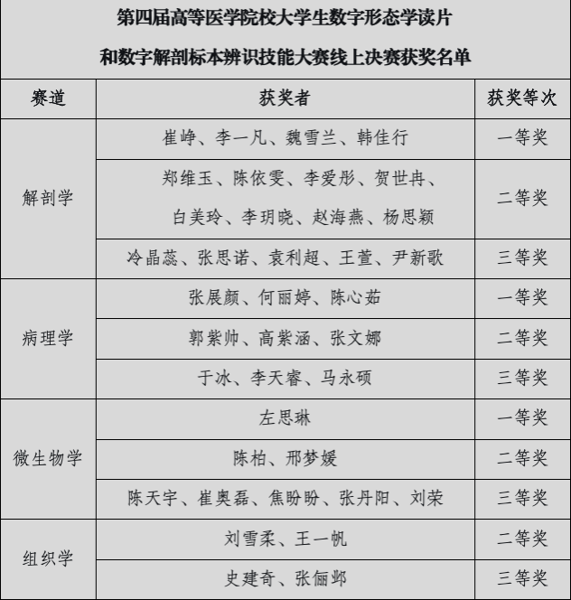 在第四届高等医学院校大学生数字形态学读片和数字解剖标本辨识技能大赛中,我校学子凭借扎实的专业基础和出色的临场发挥,在线上决赛中,共斩获一等奖8项、二等奖15项、三等奖15项,学校荣获“优秀组织奖”,其中4名学生跻身决赛前1%;在线下总决赛中勇夺2银2铜,并助力学校荣获团体季军。
