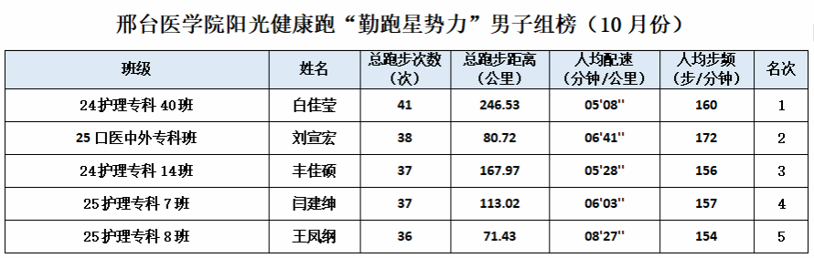 2025级口医中外专科班刘宣宏同学是本学期男子组第一名,他坦言,跑步不仅是一项运动,更是一种生活方式,跑步让他告别熬夜,大大提高了学习效率。