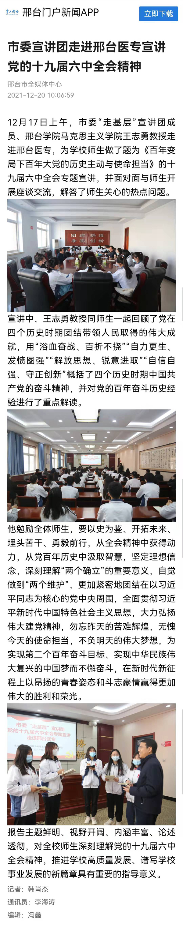 上一条:学习强国邢台学习平台报道“河北邢台:市委宣讲团走进邢台医专宣讲党的十九届六中全会精神”