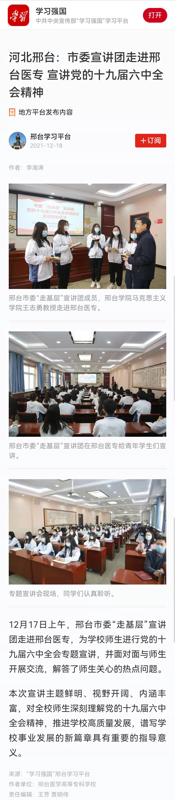 下一条:掌上邢台报道“市委宣讲团走进邢台医专宣讲党的十九届六中全会精神”