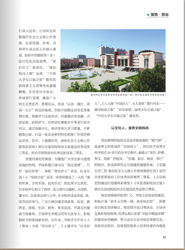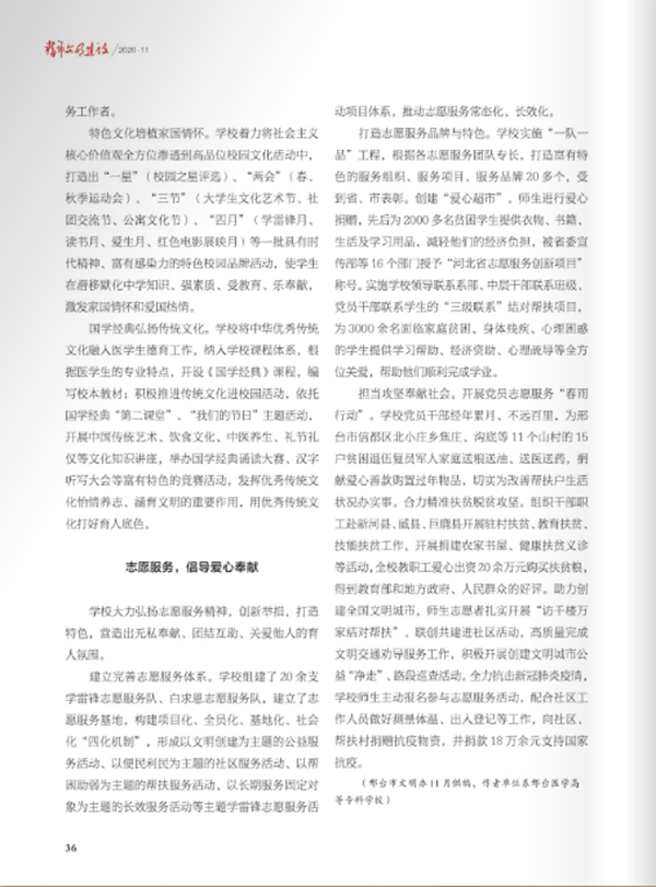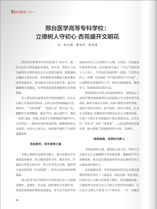 经邢台市文明办推荐,我校精神文明工作《邢台医学高等专科学校:立德树人守初心 杏苑盛开文明花》在由河北省精神文明建设委员会办公室主办的《精神文明建设》2020年第11期刊登。
