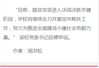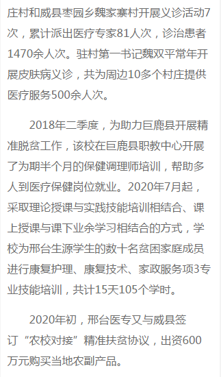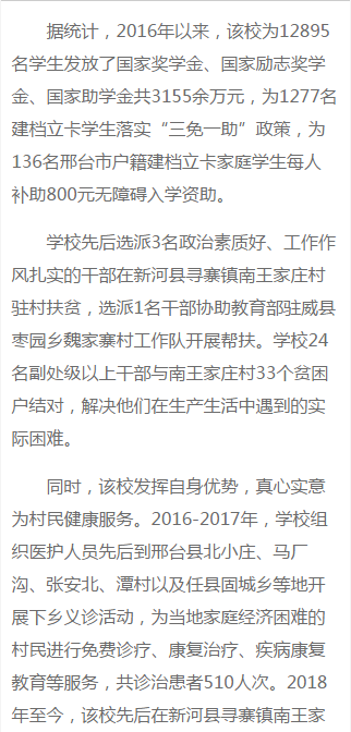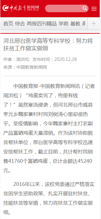 2020年12月28日,中国教育报-中国教育新闻网报道了我校扶贫工作《河北邢台医学高等专科学校:努力将扶贫工作做实做细》。报道原文如下: