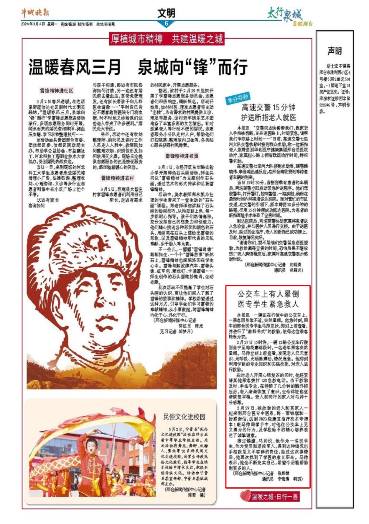 2月27日15时许,一辆12路公交车行驶到会宁至梅花寨路段时,一名老年乘客突然晕倒。马帅立刻上前查看,发现老人已无意识、无呼吸、无动脉搏动,情况危急。他即刻利用学到的专业知识和实践技能,对老人进行救助。