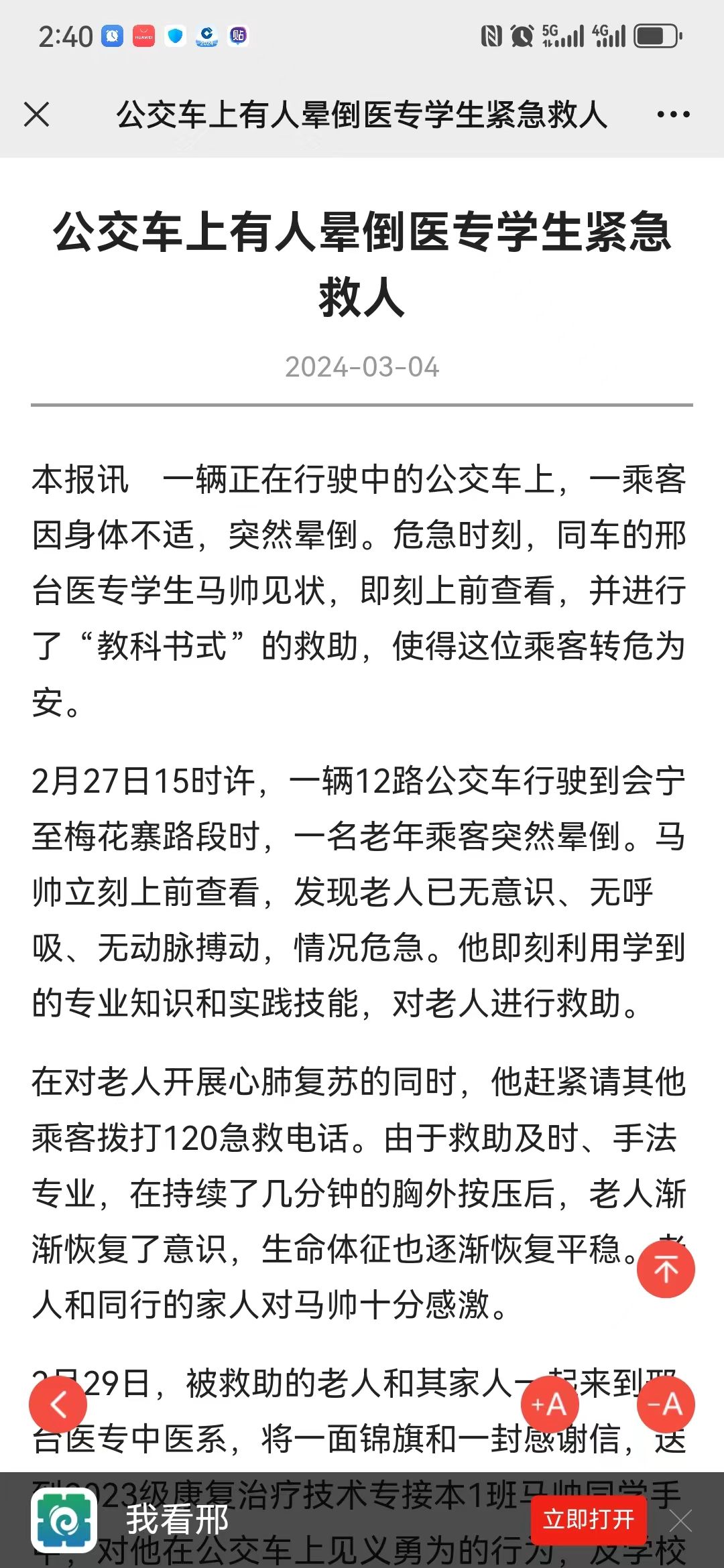 我看邢:公交车上有人晕倒 医专学生紧急救人