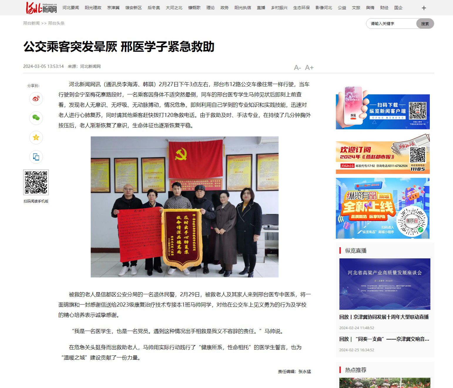 河北新闻网讯(通讯员李海涛、韩琪)2月27日下午3点左右,邢台市12路公交车像往常一样行驶,当车行驶到会宁至梅花寨路段时,一名乘客因身体不适突然晕倒,同车的邢台医专学生马帅见状后即刻上前查看,发现老人无意识、无呼吸、无动脉搏动,情况危急,即刻利用自己学到的专业知识和实践技能,迅速对老人进行心肺复苏,同时请其他乘客赶快拨打120急救电话。由于救助及时、手法专业,在持续了几分钟胸外按压后,老人渐渐恢复了意识,生命体征也逐渐恢复平稳。
