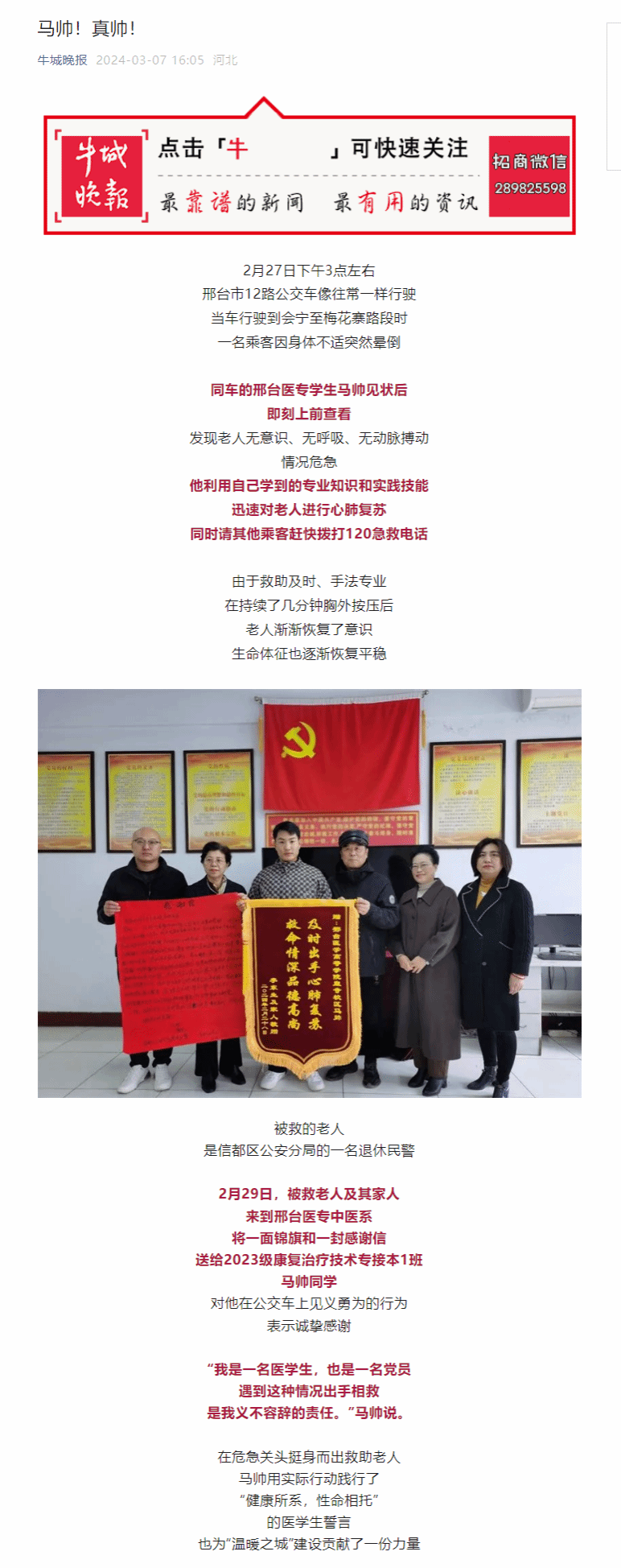 被救的老人是信都区公安分局的一名退休民警。2月29日,被救老人及其家人来到邢台医专中医系,将一面锦旗和一封感谢信送给2023级康复治疗技术专接本1班马帅同学,对他在公交车上见义勇为的行为表示诚挚感谢。“我是一名医学生,也是一名党员,遇到这种情况出手相救是我义不容辞的责任。”马帅说。