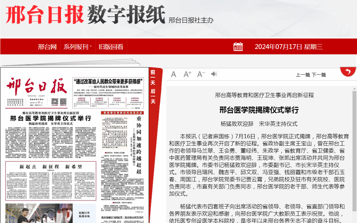 7月16日,邢台医学院正式揭牌,邢台高等教育和医疗卫生事业再次开启了新的征程。省政协副主席王宝山,曾在邢台工作的老领导马兰翠、王会勇、董经纬、朱政学,省教育厅、省卫健委、省中医药管理局有关负责同志贾海明、王现坤、张凯出席活动并共同为邢台医学院揭牌。市委书记杨猛致欢迎辞,市委副书记、市长宋华英主持仪式。市领导吕瑞民、魏吉平、邱文双、冯亚强、钱丽霞和市级老干部石玉春、周国江,邢台学院党委书记贾云霄,兄弟院校及驻市有关院校、医院负责同志,市直有关部门负责同志,邢台医学院的老干部、师生代表等参加仪式。