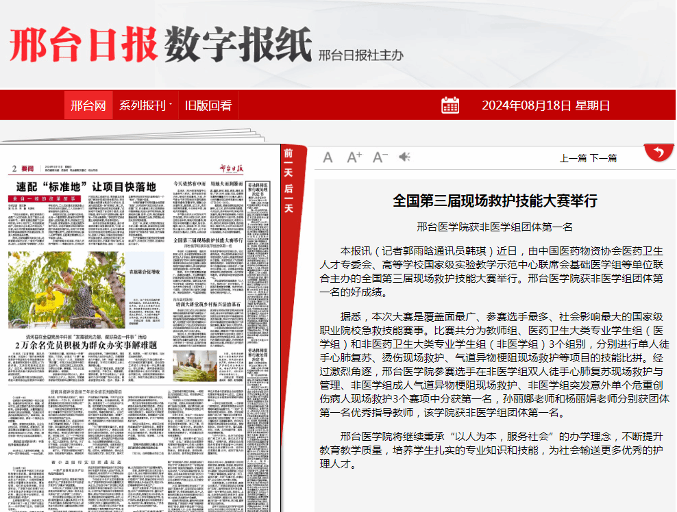 据悉,本次大赛是覆盖面最广、参赛选手最多、社会影响最大的国家级职业院校急救技能赛事。比赛共分为教师组、医药卫生大类专业学生组(医学组)和非医药卫生大类专业学生组(非医学组)3个组别,分别进行单人徒手心肺复苏、烫伤现场救护、气道异物梗阻现场救护等项目的技能比拼。经过激烈角逐,邢台医学院参赛选手在非医学组双人徒手心肺复苏现场救护与管理、非医学组成人气道异物梗阻现场救护、非医学组突发意外单个危重创伤病人现场救护3个赛项中分获第一名,孙丽娜老师和杨丽娟老师分别获团体第一名优秀指导教师,该学院获非医学组团体第一名。