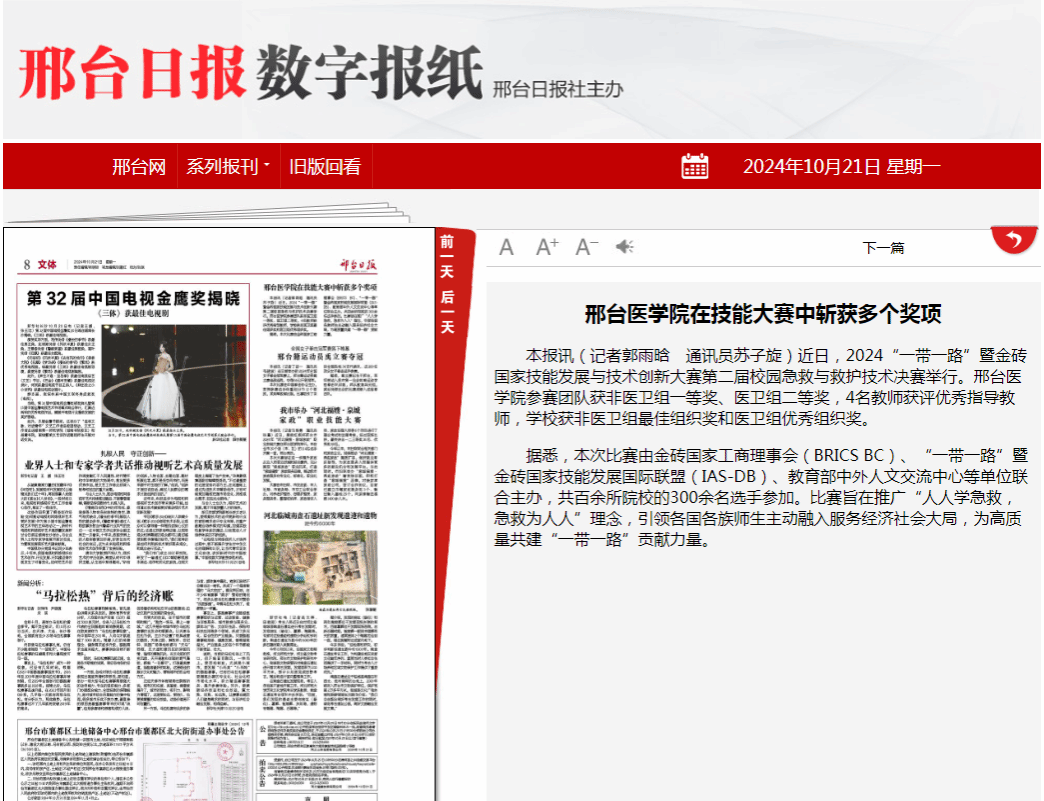 近日,2024“一带一路”暨金砖国家技能发展与技术创新大赛第二届校园急救与救护技术决赛举行。邢台医学院参赛团队获非医卫组一等奖、医卫组二等奖,4名教师获评优秀指导教师,学校获非医卫组最佳组织奖和医卫组优秀组织奖。