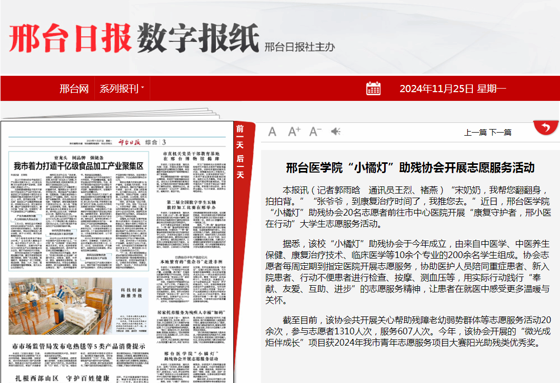 “宋奶奶,我帮您翻翻身,拍拍背。”“张爷爷,到康复治疗时间了,我推您去。”近日,邢台医学院“小橘灯”助残协会20名志愿者前往市中心医院开展“康复守护者,邢小医在行动”大学生志愿服务活动。