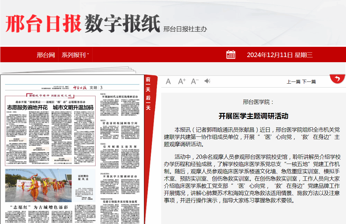 近日,邢台医学院组织全市机关党建联学共建第一协作组成员单位,开展“‘医’心向党,‘救’在身边”主题观摩调研活动。