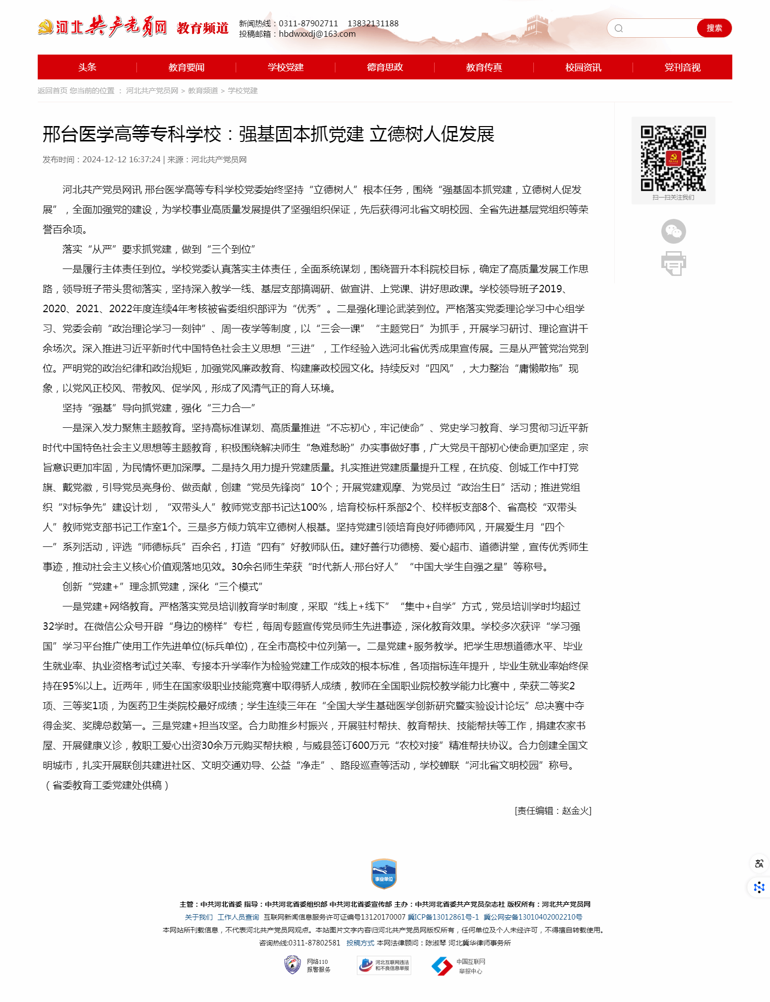学校党委始终坚持“立德树人”根本任务,围绕“强基固本抓党建,立德树人促发展”,全面加强党的建设,为学校事业高质量发展提供了坚强组织保证,先后获得河北省文明校园、全省先进基层党组织等荣誉百余项。