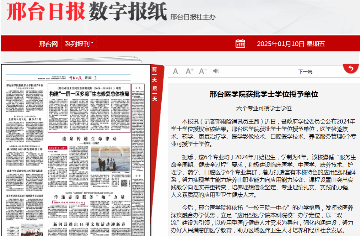 近日,省政府学位委员会公布2024年学士学位授权审核结果。邢台医学院获批学士学位授予单位,医学检验技术、药学、康复治疗学、医学影像技术、口腔医学技术、养老服务管理6个专业可授学士学位。