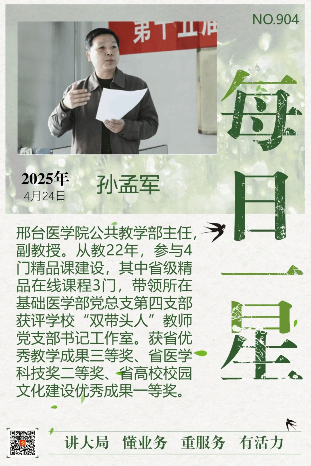 学校紧扣“讲大局、懂业务、重服务、有活力”总要求,坚持党建领航,聚焦重点任务,持续提高工作效率,转变工作作风,加强党员干部和教师队伍建设,涌现出一批叫得响、立得住、过得硬、师生认可的先进典型。经组织宣传统战部推荐,公共教学部主任孙孟军被市直工委评为4月24日“每日一星”,事迹在“机关党建订阅号”【每日一星·四型干部】栏目报道。