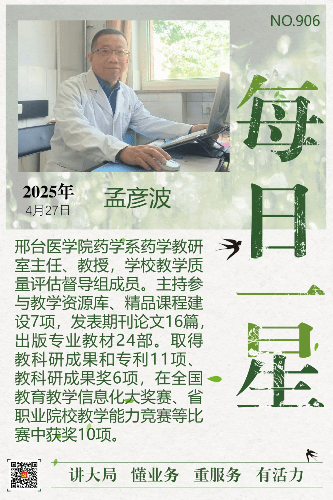 学校紧扣“讲大局、懂业务、重服务、有活力”总要求,坚持党建领航,聚焦重点任务,持续提高工作效率,转变工作作风,加强党员干部和教师队伍建设,涌现出一批叫得响、立得住、过得硬、师生认可的先进典型。经组织宣传统战部推荐,药学系药学教研室主任孟彦波被市直工委评为4月27日“每日一星”,事迹在“机关党建订阅号”【每日一星·四型干部】栏目报道。