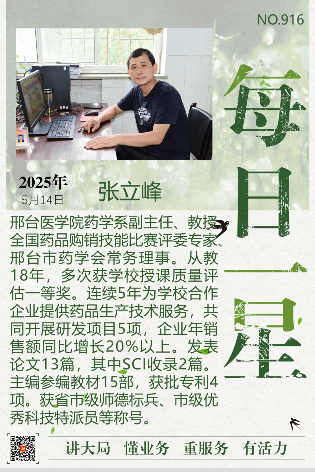 学校紧扣“讲大局、懂业务、重服务、有活力”总要求,坚持党建领航,聚焦重点任务,持续提高工作效率,转变工作作风,加强党员干部和教师队伍建设,涌现出一批叫得响、立得住、过得硬、师生认可的先进典型。经组织宣传统战部推荐,药学系副主任张立峰被市直工委评为5月14日“每日一星”,事迹在“机关党建订阅号”【每日一星·四型干部】栏目报道。