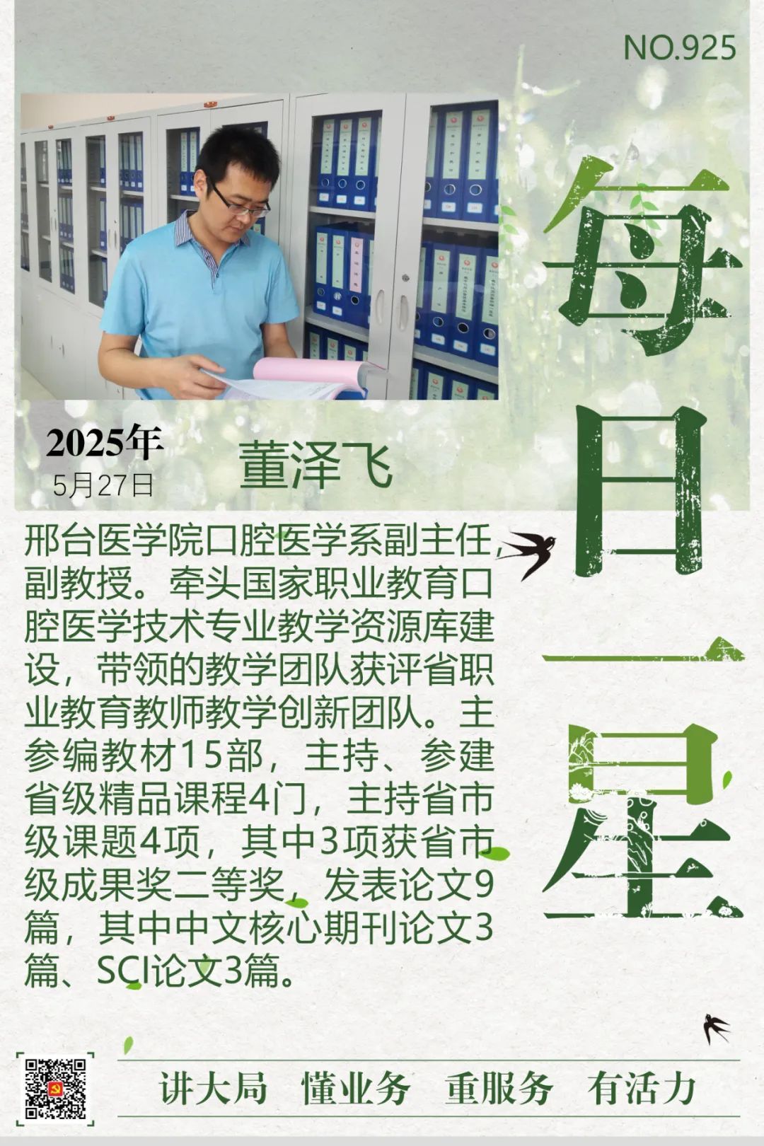 学校紧扣“讲大局、懂业务、重服务、有活力”总要求,坚持党建领航,聚焦重点任务,持续提高工作效率,转变工作作风,加强党员干部和教师队伍建设,涌现出一批叫得响、立得住、过得硬、师生认可的先进典型。经组织宣传统战部推荐,口腔医学系副主任董泽飞被市直工委评为5月27日“每日一星”,事迹在“机关党建订阅号”【每日一星·四型干部】栏目报道。