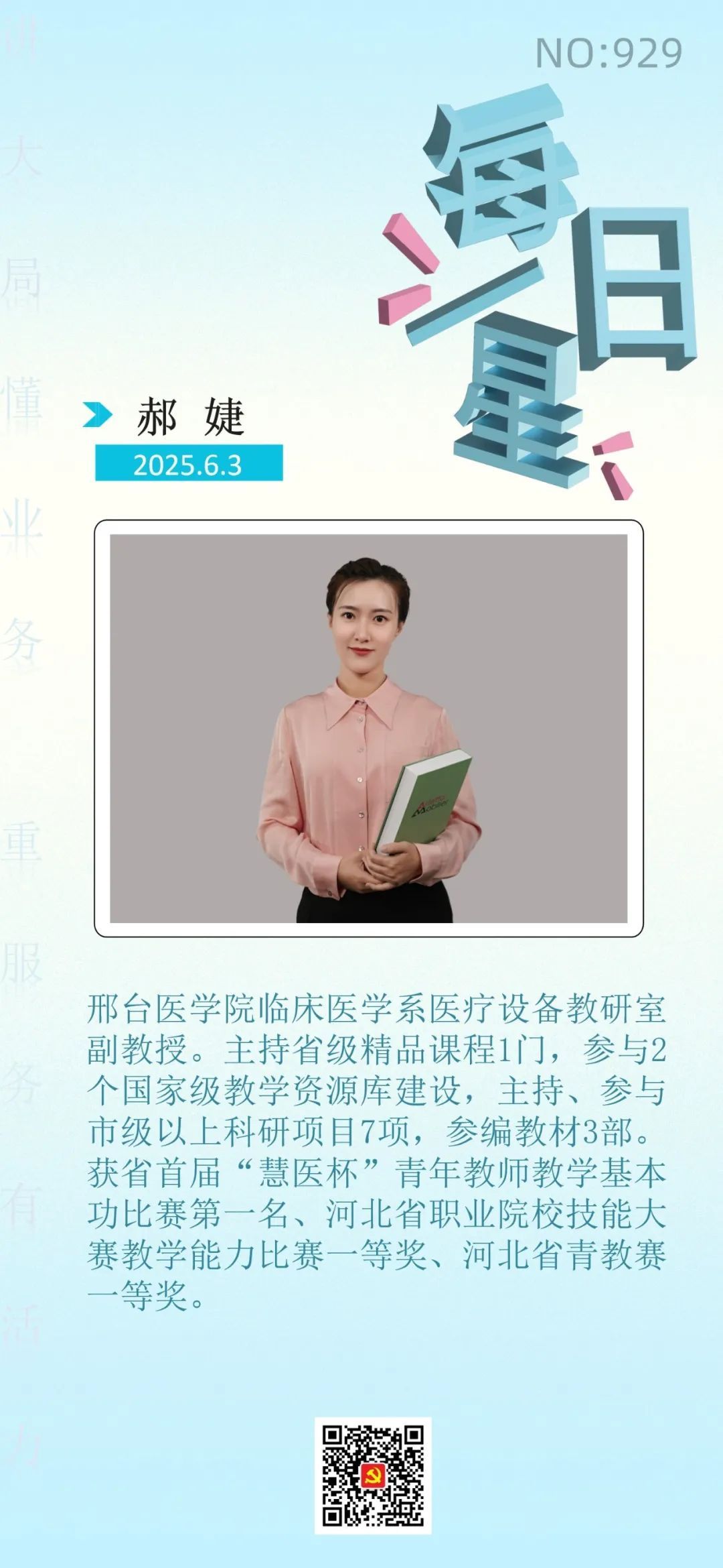 学校紧扣“讲大局、懂业务、重服务、有活力”总要求,坚持党建领航,聚焦重点任务,持续提高工作效率,转变工作作风,加强党员干部和教师队伍建设,涌现出一批叫得响、立得住、过得硬、师生认可的先进典型。经组织宣传统战部推荐,临床医学系医疗设备教研室副教授郝婕被市直工委评为6月3日“每日一星”,事迹在“机关党建订阅号”【每日一星·四型干部】栏目报道。