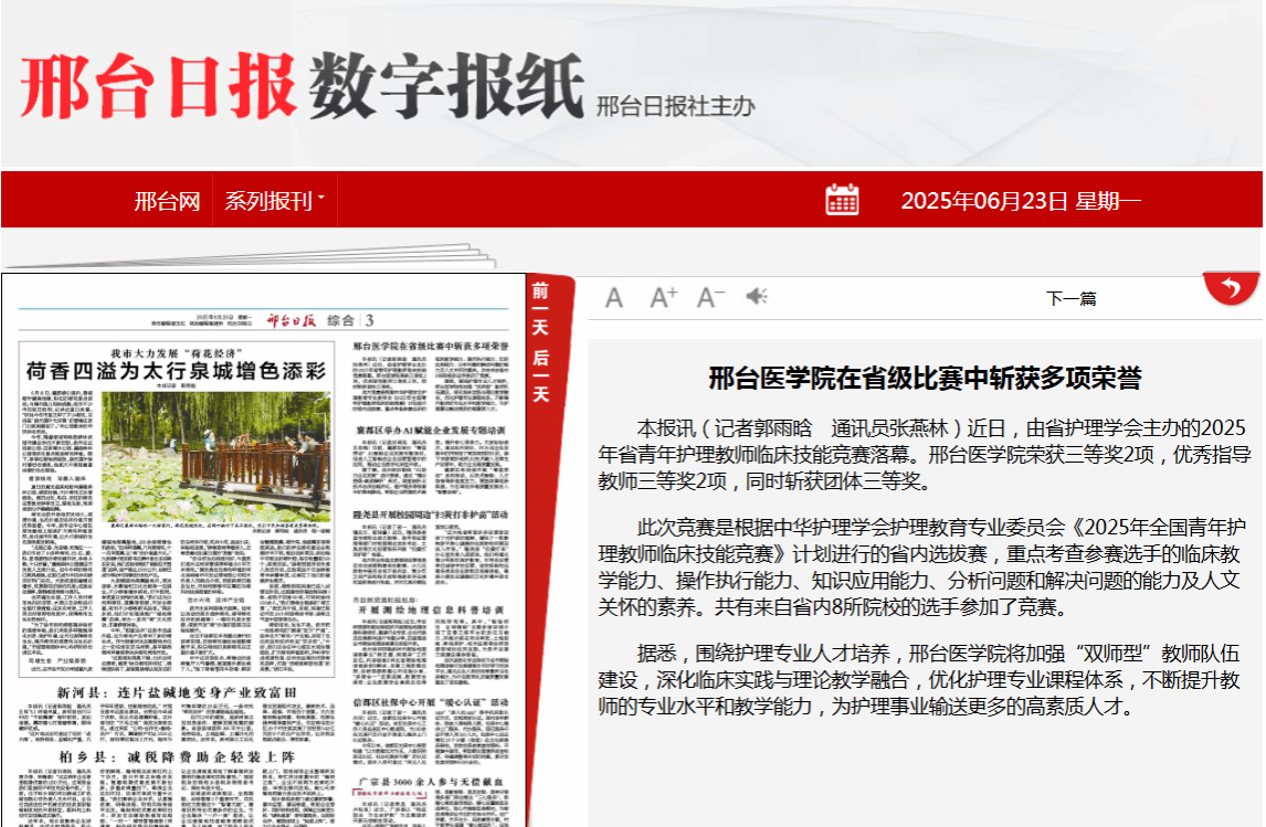 近日,由省护理学会主办的2025年省青年护理教师临床技能竞赛落幕。邢台医学院荣获三等奖2项,优秀指导教师三等奖2项,同时斩获团体三等奖。