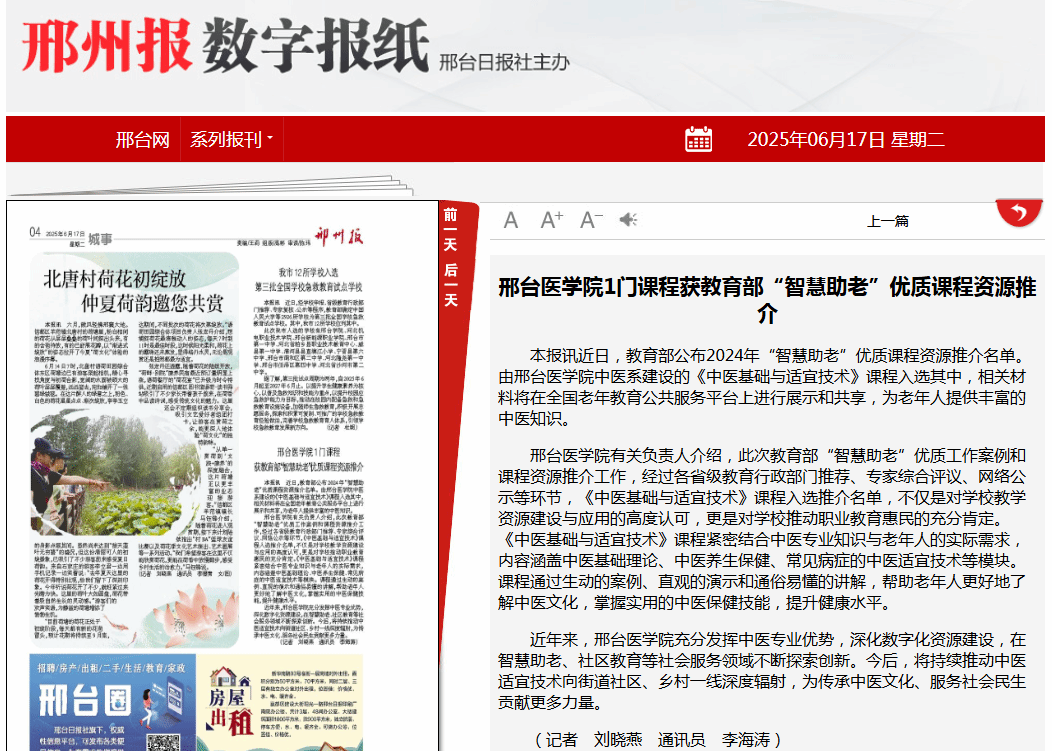 邢台医学院有关负责人介绍,此次教育部“智慧助老”优质工作案例和课程资源推介工作,经过各省级教育行政部门推荐、专家综合评议、网络公示等环节,《中医基础与适宜技术》课程入选推介名单,不仅是对学校教学资源建设与应用的高度认可,更是对学校推动职业教育惠民的充分肯定。《中医基础与适宜技术》课程紧密结合中医专业知识与老年人的实际需求,内容涵盖中医基础理论、中医养生保健、常见病症的中医适宜技术等模块。课程通过生动的案例、直观的演示和通俗易懂的讲解,帮助老年人更好地了解中医文化,掌握实用的中医保健技能,提升健康水平。