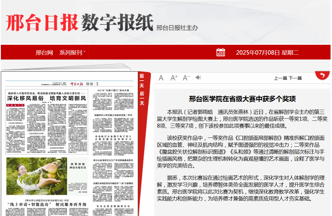 近日,在省解剖学会主办的第三届大学生解剖学绘图大赛上,邢台医学院选送的作品斩获一等奖1项、二等奖8项、三等奖7项,创下该校参加此项赛事以来的最佳成绩。