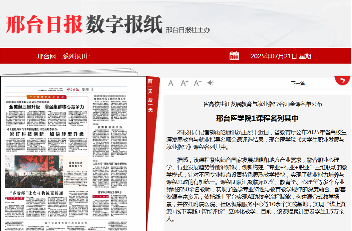 近日,省教育厅公布2025年省高校生涯发展教育与就业指导名师金课评选结果,邢台医学院《大学生职业发展与就业指导》课程名列其中。