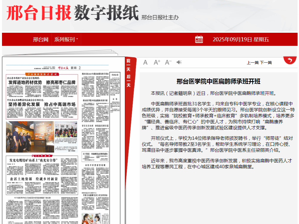 中医扁鹊师承班首批31名学生,均来自专科中医学专业,在核心课程中成绩优异,并自愿接受每周3个半天的跟师见习。邢台医学院创新设立这一特色班级,实施“院校教育+师承教育+临床教育”多轨制培养模式,培养更多“懂经典、善临床、有仁心”的中医人才,为我市持续打响“扁鹊康养牌”、推进省级中医药传承创新发展试验区建设提供人才支撑。