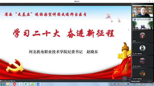 12月29日上午,学校举办党的二十大精神宣讲报告会,特邀省委“走基层”进校园宣讲分团成员、河北机电职业技术学院纪委书记赵晓东通过线上方式为我校师生做题为《学习二十大 奋进新征程》的专题宣讲,学校师生代表共2...