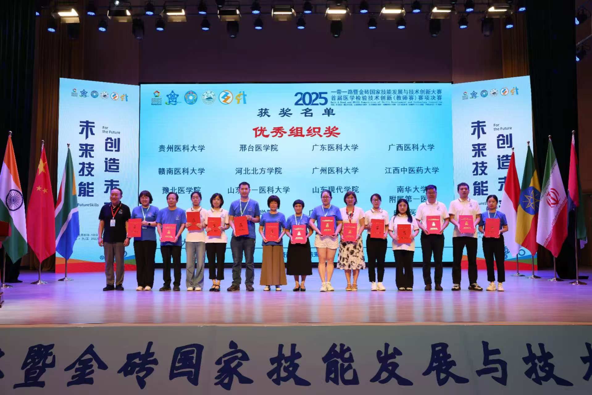 近日,由教育部主办、九江学院承办的2025“一带一路”暨金砖国家技能发展与技术创新大赛落下帷幕。我校医疗技术系王若潼、张笑笑、宋树言、齐瑞、王聪聪、秦雨诗6名教师在医学检验技术创新赛项中,凭借扎实的专业功底与创新实践能力,斩获二等奖1项、三等奖5项,学校荣获“优秀组织奖”。右二为我校获奖教师王若潼由左至右依次为秦雨诗、齐瑞、王若潼、宋艳荣(裁判)、宋树言、王聪聪、张笑笑赛前,我校高度重视、精心组织,从备赛指导到资源保障全程护航。...